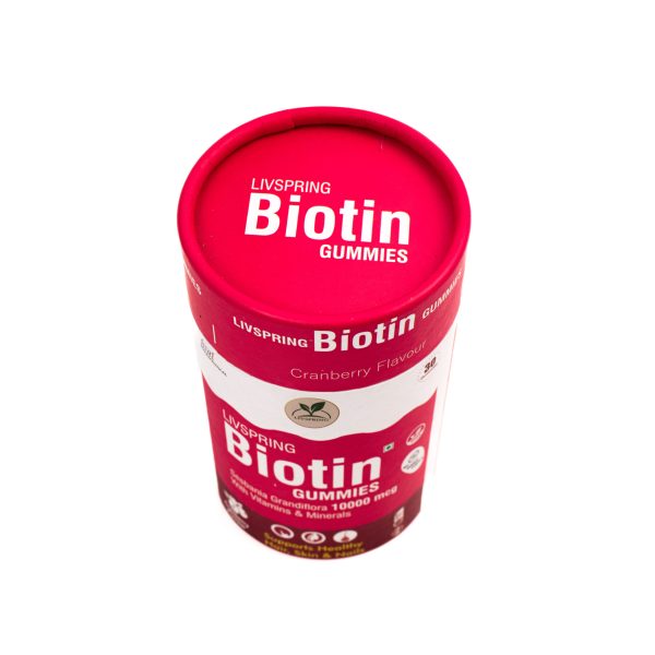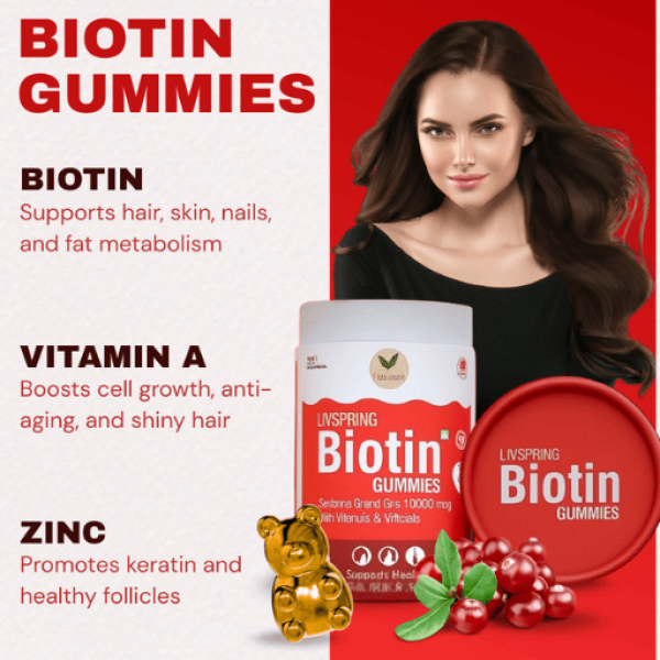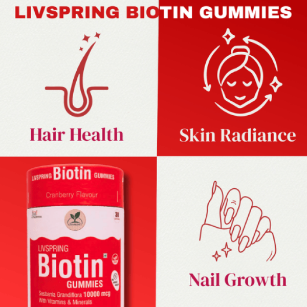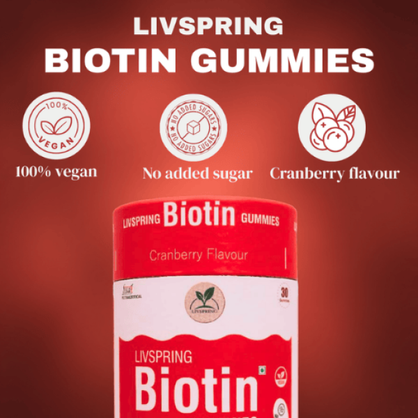 Formulated with 10,000 mcg Biotin, Vitamins A & B12, and Zinc, LivSpring Biotin Gummies nourish your hair, skin, and nails from within — all in a tasty cranberry flavour.